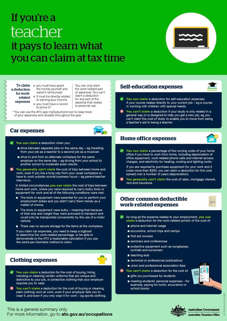 Teachers, do you know what you can claim at tax time? Check out this handy ATO guide then call me on 0481 02 44 66 to book your appointment.
